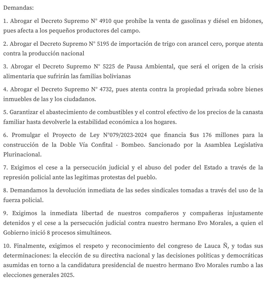 Blockaders' official demand list continues to include an "end to judicial persecution" of Morales, recognition of his faction of the MAS-IPSP as the legitimate one, not that of President Luis Arce. lostiempos.com/actualidad/pais/20241017/evistas-ponen-10-condiciones-dialogar-ellas-es-cesar-persecucion-evo
