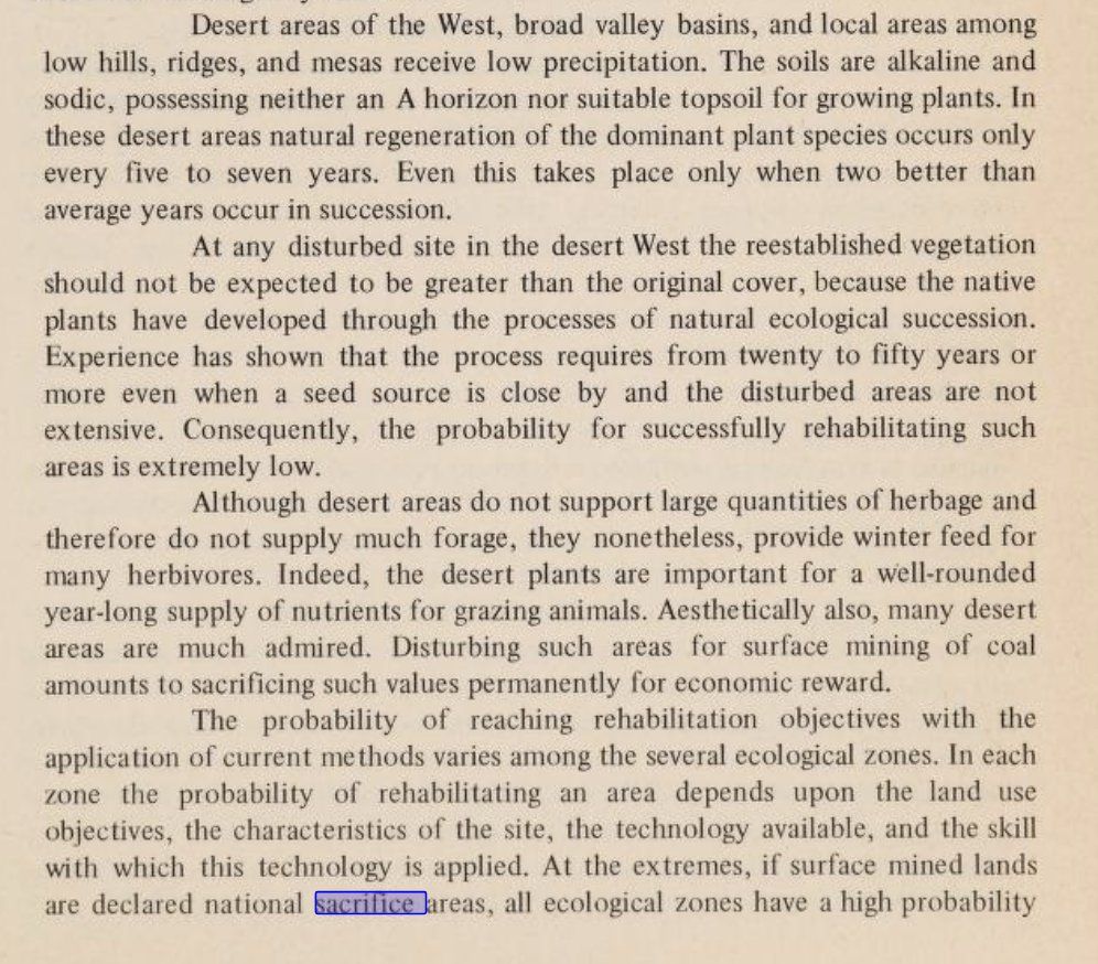 @DrX_ADunlap @judithverweijen @PolEcoNet @EnvJustice @Env_Pol @Andrea__CJN @Anthropogo @blackhawk_exile @DecoloniseGeog @HGJournal @PeterGelderloos Here's the original context, by which the NAS proposed that "Abandon the Spoils" be the "rehabilitation goal" for strip mining in low-rainfall areas. archive.org/details/rehabilitationpo0000nati/page/86/mode/2up?q=sacrifice&view=theater