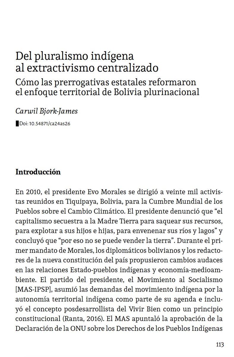 It traces the Movement Towards Socialism's environmental governance from early hopes of a Indigenous-centered re-envisioning of territory to a centralized vision where "every square centimeter" is available for development, culminating in the disastrous fire season of 2019.