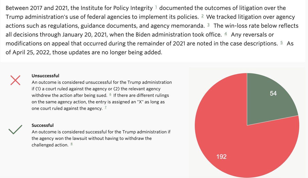 First Trump administration lost heavily in the courts when challenged on policy: 172 failures / 54 successes and even 42 failures / 30 successes before Republican-appointed judges. source: policyintegrity.org/trump-court-roundup (h/t Corey Robin)