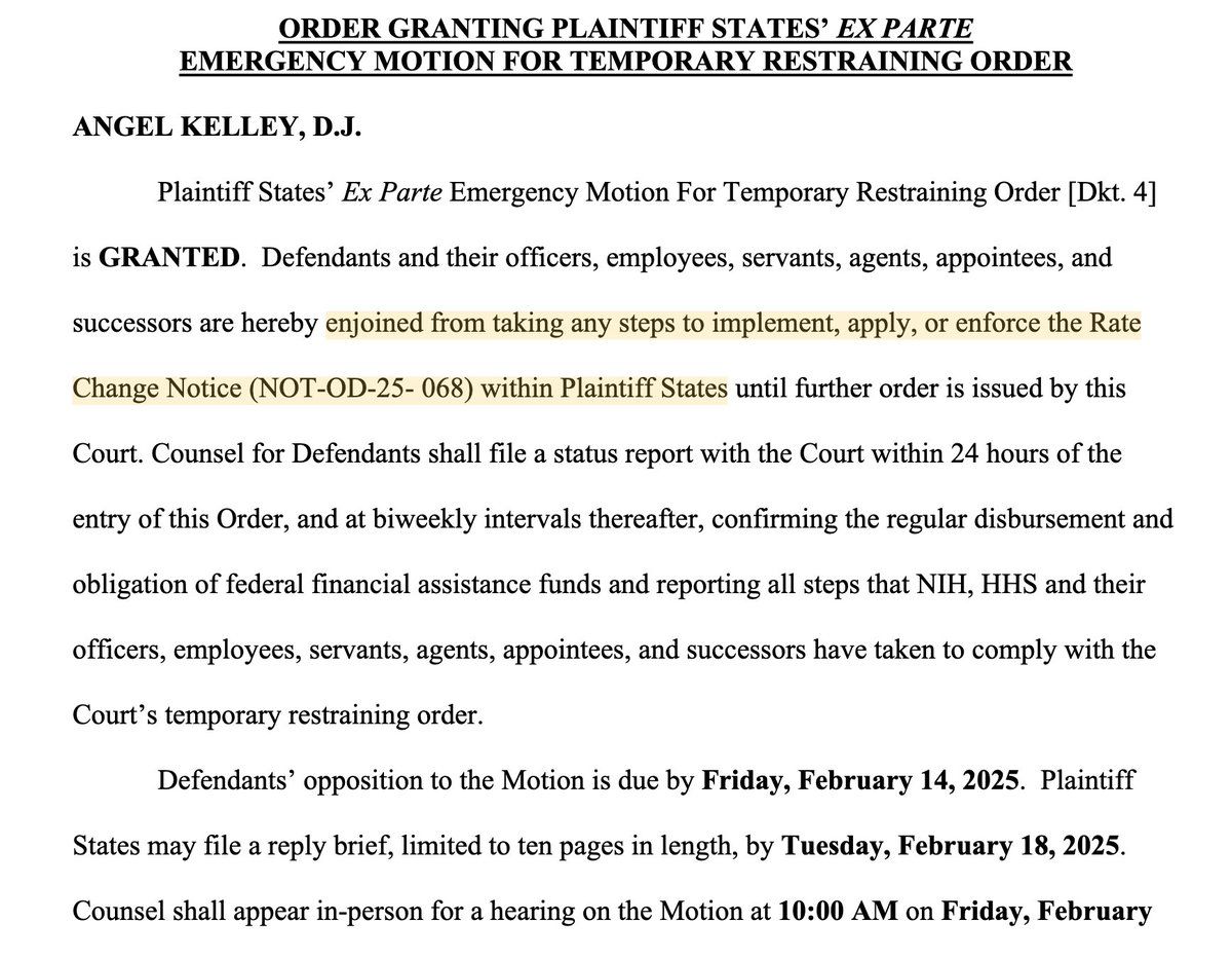 1. Federal Judge Angel Kelley has issued a Temporary Restraining Order blocking NIH from cutting indirect costs, threatening university funding. As issued, order only applies in the 22 "Plaintiff States," so for now NIH can cut dollars off to red-state research universities.