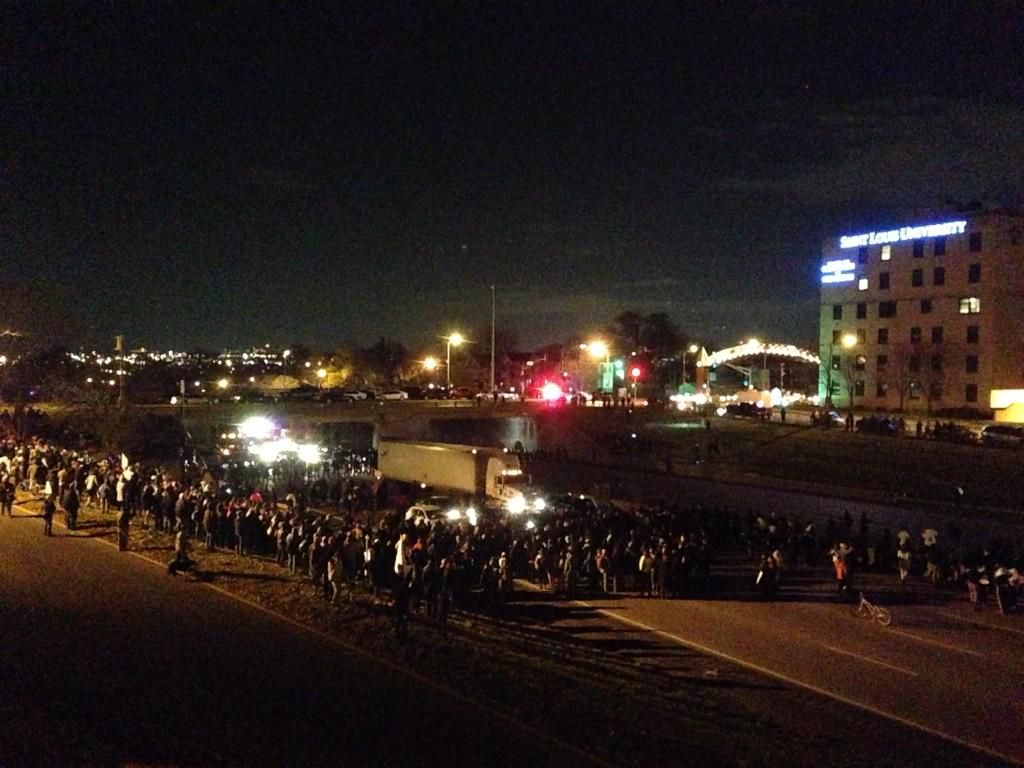 : Chanting "no justice no peace" at shut down interstate 44 and Grand. #FergusonDecision