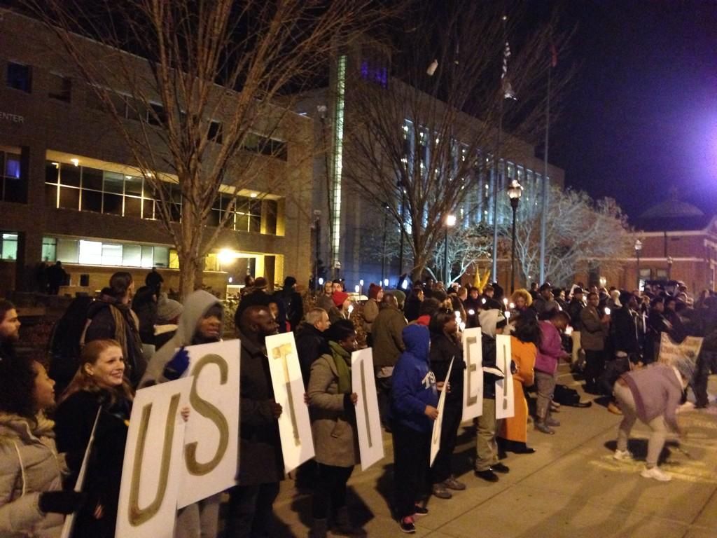 : About 100 demonstrators are gathered in front of the Nash PD #Ferguson