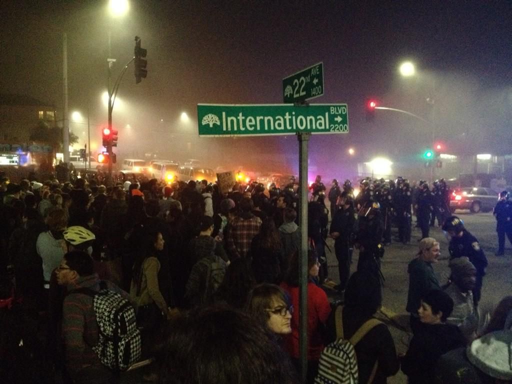 : Police have trapped the protestors on intl and 42nd in #Oakland ”