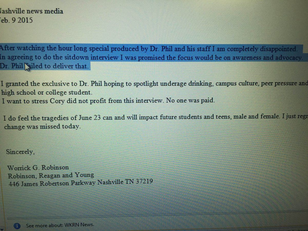 : Statement from Cory Batey's attorney, Worrick Robinson, regarding interview with Dr. Phil.