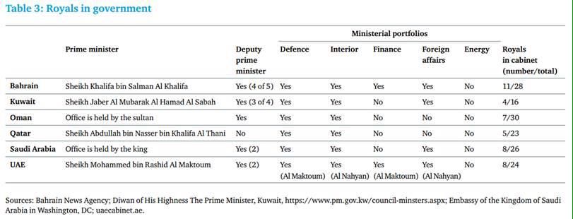 : Royals in Cabinet Bahrain 11/28 Kuwait 4/16 Oman 7/30 Qatar 5/23 Saudi Arabia 8/26 UAE 8/24