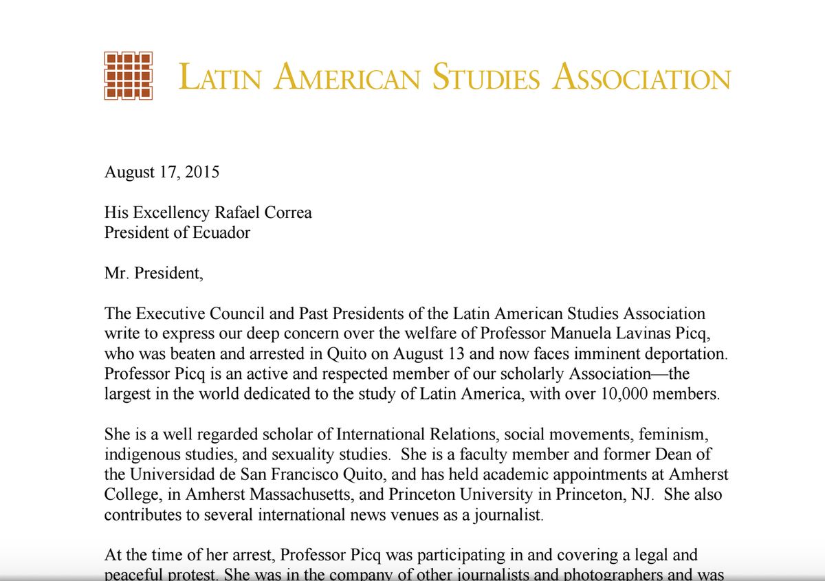 Latin American Studies Assoc letter in solidarity w/ Prof #ManuelaPicq in Ecuador