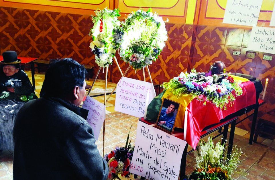 Coffin of 5th dead miner Pedro Mamani Massi, killed by police gunfire, lies surrounded by placards, El Alto.