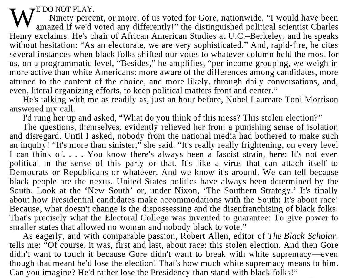 June Jordan, offering a round-up of Black reactions to the 2000 election