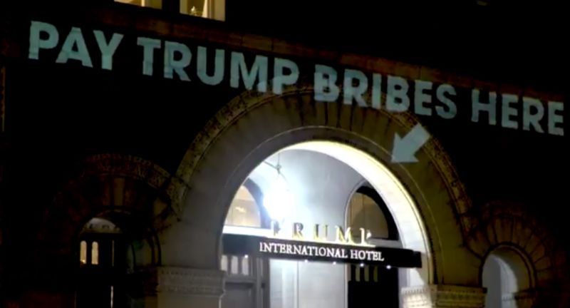 : 'Pay Trump Bribes Here' projected by protesters onto Trump's DC hotel