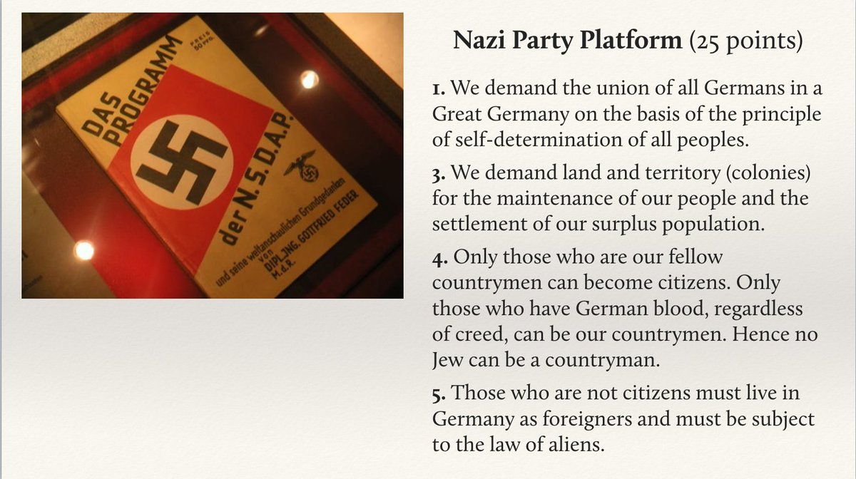 Bulk of Nazi platform is devoted (surprise) to hostility to Jews and non-German citizens. en.wikipedia.org/wiki/National_Socialist_Program#The_25-point_Program_of_the_NSDAP @DineshDSouza