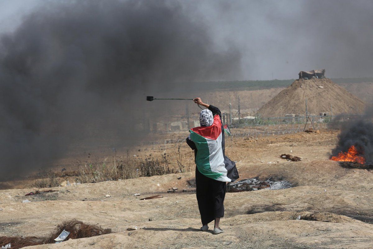 "The US has used 43 vetoes against the Palestinians, but we have the right to freedom, and the superpowers will not give it to us so that we will take our right by our own hands.”—Etaf Wadi, a mother of 8, tries her hand at a slingshot #GreatReturnMarch