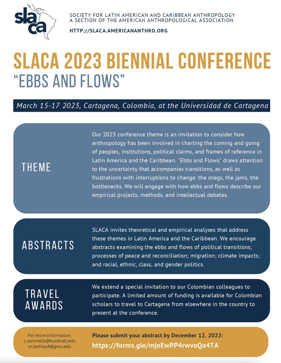 The Society for Latin American and Caribbean Anthropology @SLACAnthro is having its biannual conference in Cartagena, Colombia. March 15-17, 2023 Theme is "Ebbs and Flows" Paper proposals are due December 12.